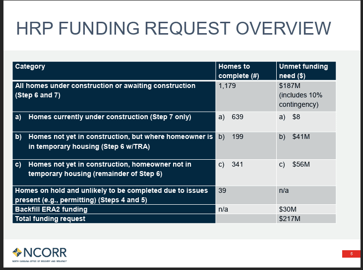 A majority of the meeting was spent on the first testimony given by Pryor Gibson, the interim director of the North Carolina Office of Recovery & Resiliency (NCORR). During Gibson’s testimony, he presented updated figures from recent month’s progress and figures explaining the agency’s request for $217 million in new funding in order to complete recovery efforts in Eastern North Carolina for those impacted by Hurricanes Matthew and Florence. In November 2024, at the last meeting of the year, the estimated need was $264 million. Since then, lawmakers have allocated $80 million, and the updated ask of $217 million does not include this allocation.