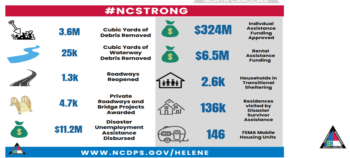 The second and third parts of the meeting included an update from the NC Department of Emergency Management Director Will Wray and an overview from Mark White of the Fiscal Research Division on federal funding included in the American Relief Act of 2025 and North Carolina, as well as the process and timeline for actually pulling down the federal funds for recovery efforts in Western NC.
