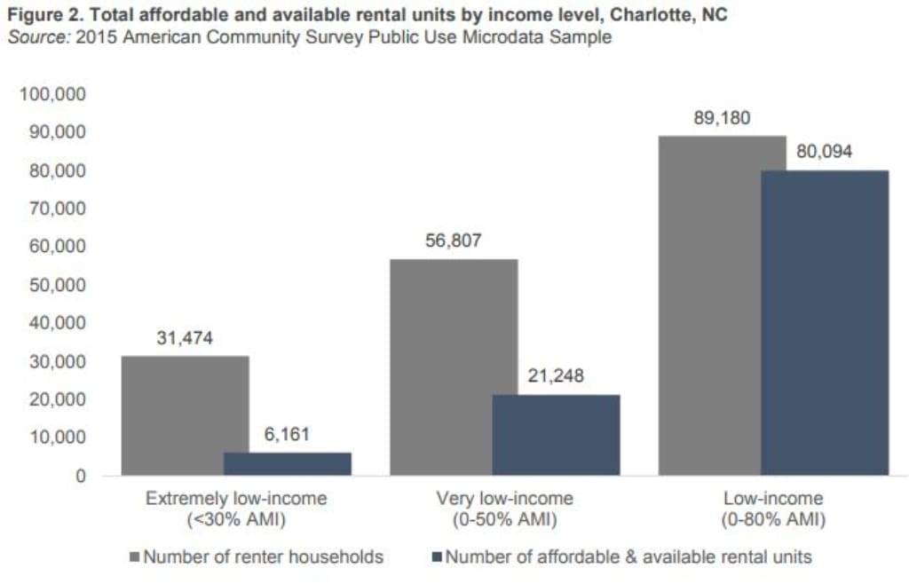 This makes Charlotte’s housing gap for any family making below $45,000 a year is 30,281 units